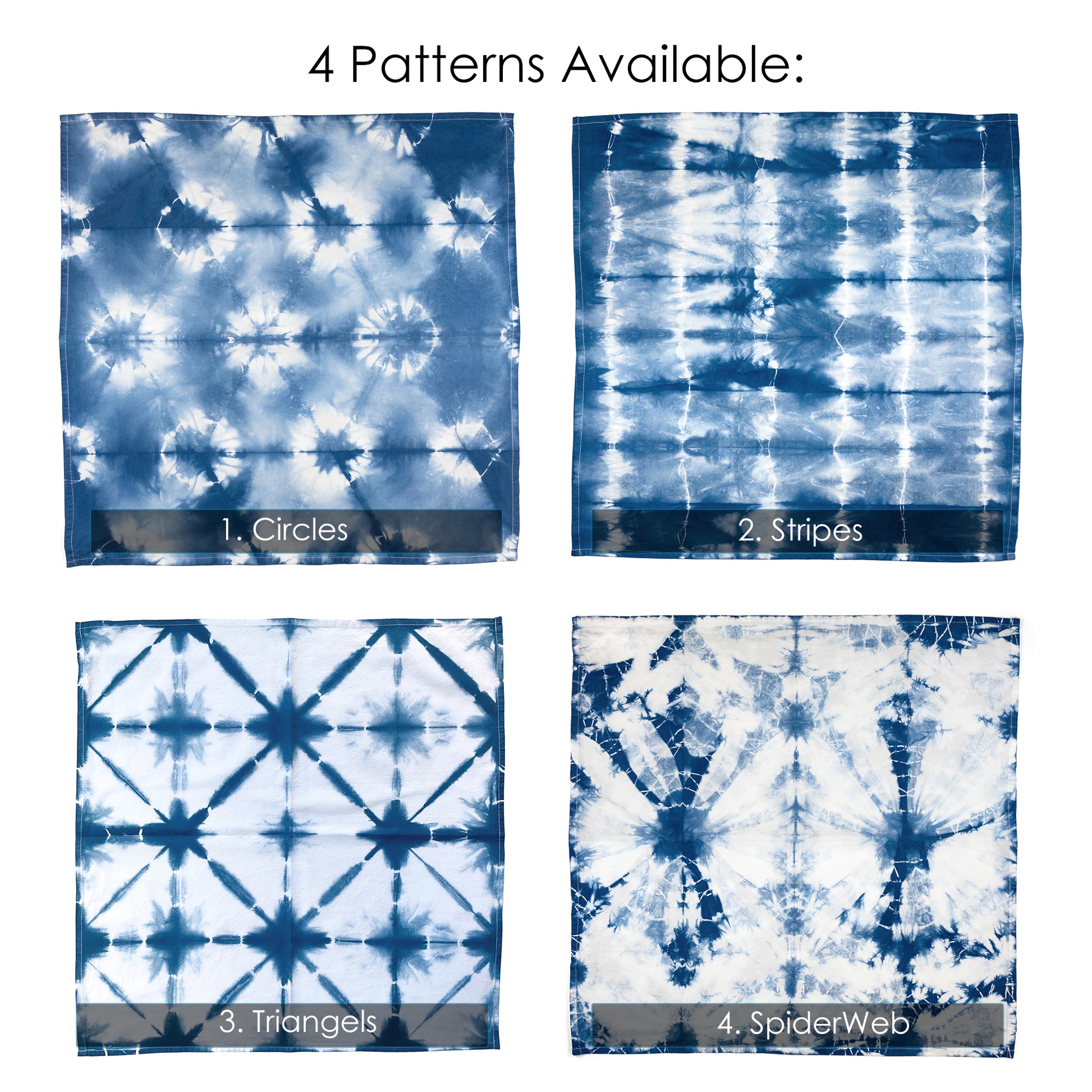 The towels are professionally dyed in a classic indigo blue and triple washed so they will not shrink, fade, or bleed if properly cared for. Each towel is carefully pressed, bound, and dyed in my Maryland studio to create one of 4 different shibori patterns. Available individually or as a set of all 4 towels.